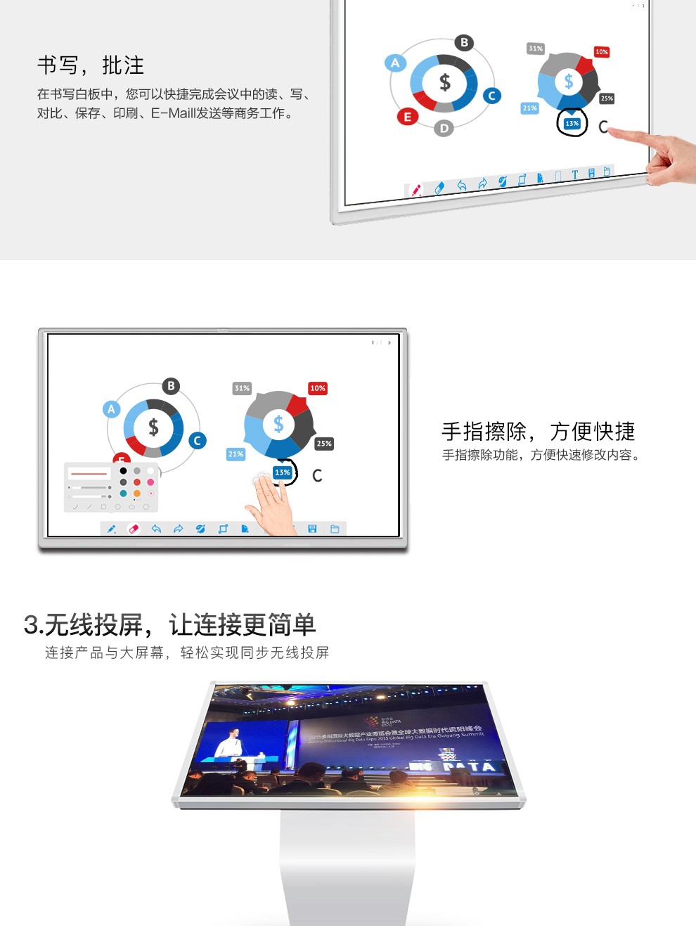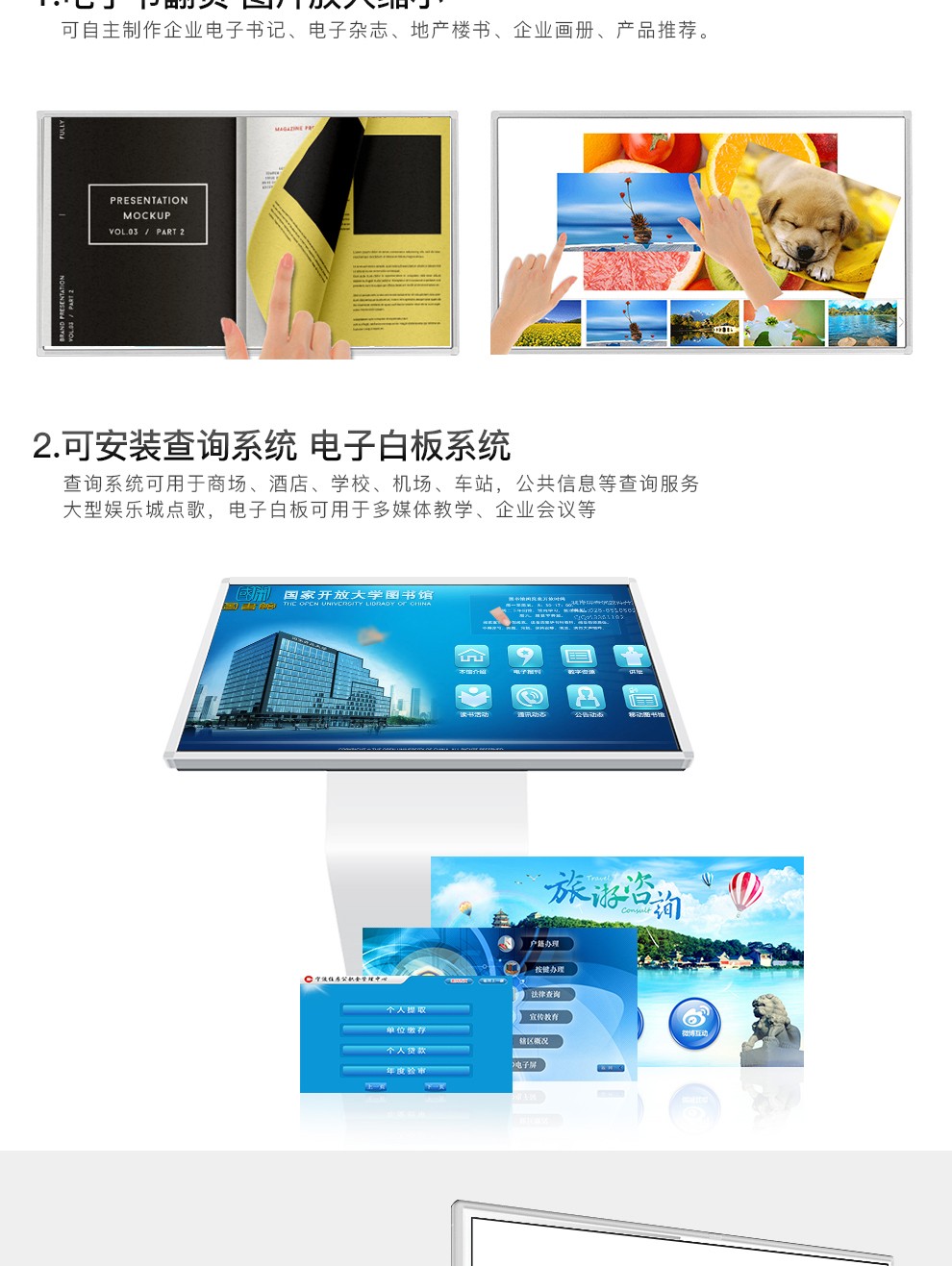 1、新商品促銷:如果新商品在初期上市,我們在促銷時會經常出示實物樣品。如果放在不同的地方,實物樣品很不方便。這樣,觸摸一體機就解決了顯示的瓶頸。比如一個商品房,有多少層,每種戶型,在實施展覽時,觸動房屋的3D形象就有了很好的機會。如果客人想了解房子的樓層和戶型,只需觸摸屏幕,選擇自己的樓層和戶型,進入屏幕,就可以一次看到不同的戶型和樓層。初選結束后,他會去看實物,這樣是一種快捷的選房方式,提高了選房效率。