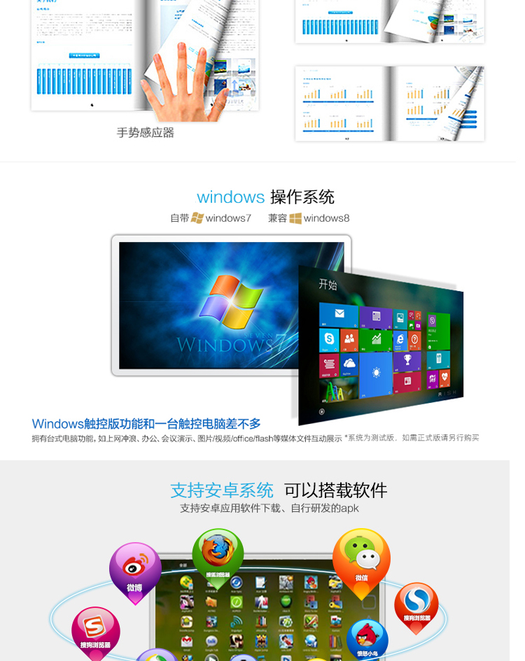 1、人機互動功能:用肢體動作便可以翻閱、查詢文字、圖片、視頻等內容,實現人機交互的功能。